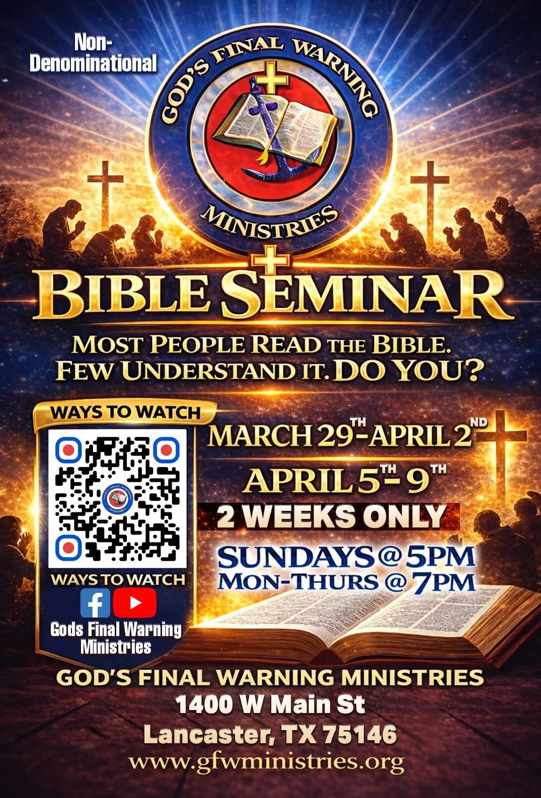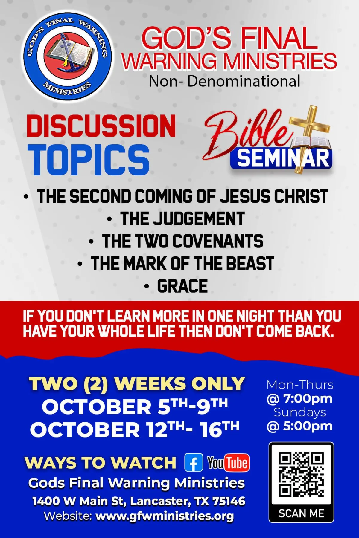 The seminar will be held at God’s Final Warning Ministries.